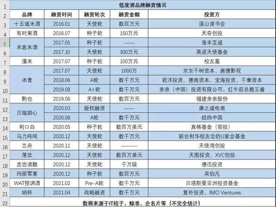 据不完全统计,从2016年至今,行业内至少15个品牌获得融资,其中冰青完成三轮融资。仅2020年以后,就有9个低度酒品牌获得融资。