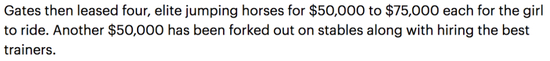 在支持女儿爱好这件事上,富豪们绝对做到了不遗余力、下足血本,买马场、陪训练,又花时间又花钱。盖茨夫妇更是在其间彰显了绝对的财力。