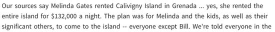 TMZ还提到,梅琳达曾在宣布离婚消息前租下了一个岛带着孩子和一众家人前往避世,当然除盖茨在外: