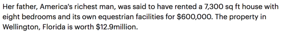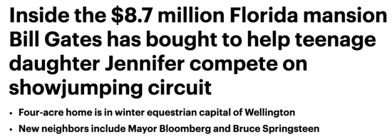为了让女儿可以更方便地专心训练,作为父母的盖茨夫妇直接在附近以60万美金的租金租下了一套带马房的八居室豪宅: