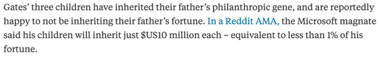 所以他们会宣在有生之年把财产全部捐掉,只给三个孩子每人留1000万美金: