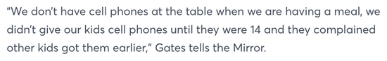 ▲ 盖茨告诉《镜报》,孩子们是直到14岁才拥有了自己的手机,尽管之前对于落后同龄人有太多抱怨,但也无济于事。家庭内部原则问题是不能轻易调整和妥协的。即使在拥有手机后,父母也严格限制了他们的使用时间,避免耽误正事和晚上的睡意。