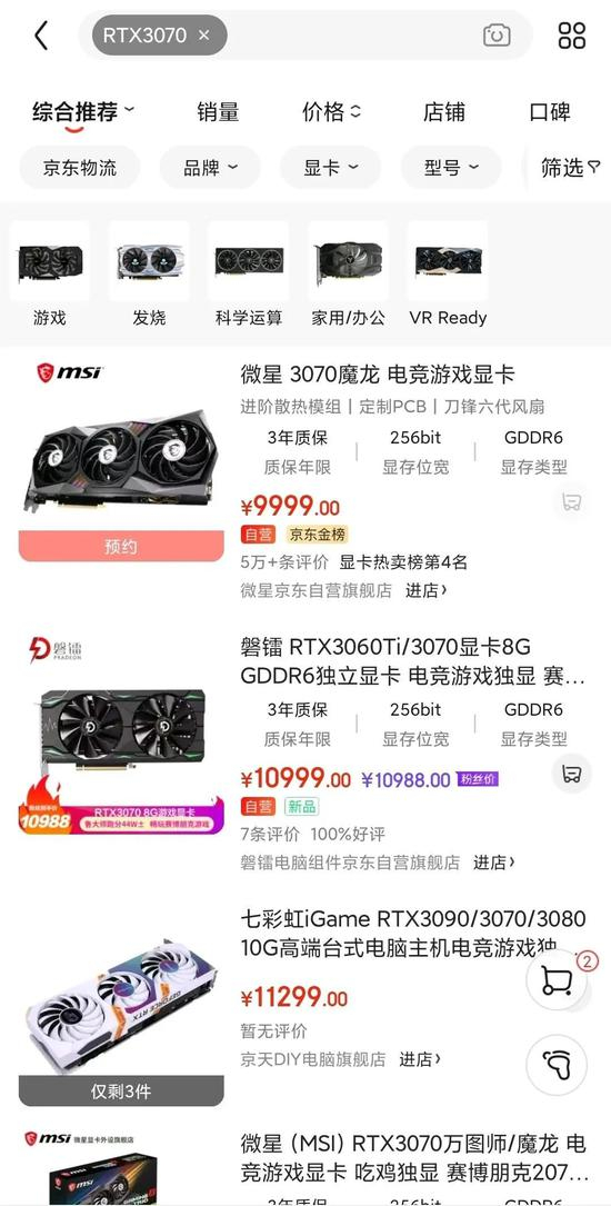 随便打开一个电商平台,你会发现官方指定价5499元的RTX3080显卡已暴涨至2万多元,而官方售价3899元的RTX3070显卡的价格也被炒到8000元以上。