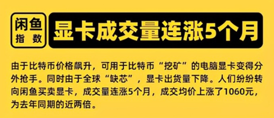 你根本不知道有多少人正在利用显卡的高溢价赚得盆满钵满——闲鱼官方数据显示,从去年11月至今年3月,闲鱼上的显卡成交量连涨5个月,成交均价上涨了1060元,为去年同期的2倍。