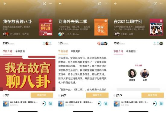 内容付费订阅是播客节目商业化的一种普遍解决方案。小宇宙引入了“我在故宫聊八卦”“当海外去第二季”“在2021聊性别”等多档付费订阅音频,其中最卖座的销售量为4740,总收入为11.8万余元。