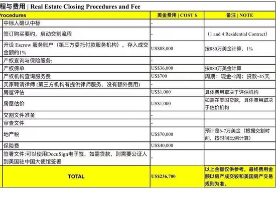 镁编了解到,房子的过户事宜是要通过由麦迪委托的房产经纪人办理的。从交易费用和流程清单看,这套房子的地产税预计6万~7万美元,折合人民币38万~45万元。