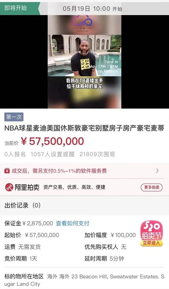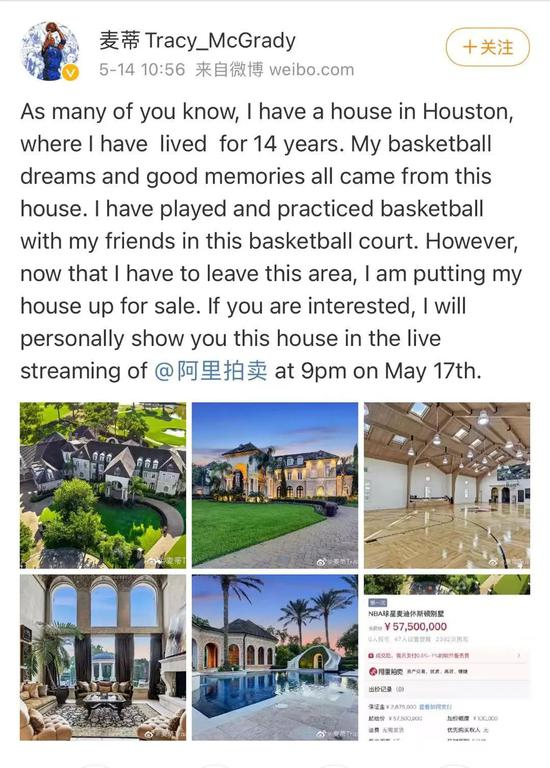 真豪横,随口一说就是几千万的大生意。中方伙伴想必也是有些懵,当然直接说“OK、OK”。经过一个多月的沟通接洽,麦迪在休斯敦的大别墅就这样来了国内,并且上了阿里拍卖平台。