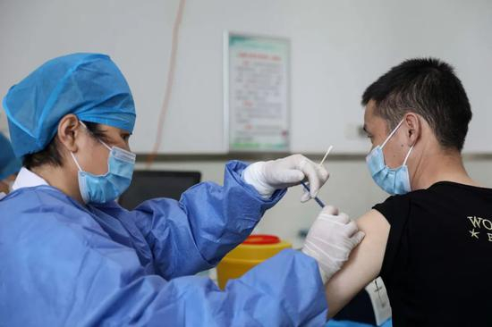 5月18日,市民在沈阳市大东区新冠疫苗接种方舱接种新冠疫苗。新华社记者 杨青 摄