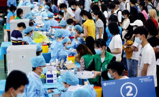 5月13日,安徽合肥市,安徽农业大学师生在蜀山区的一处新冠疫苗方舱式巡回接种点接种。图/澎湃影像