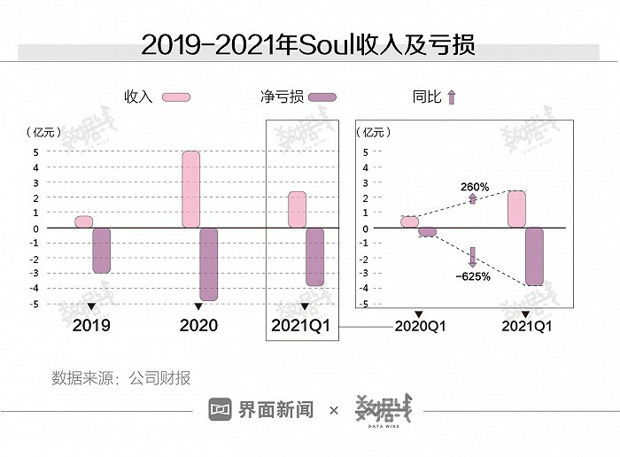 计划赴美上市的Soul已经连续2年亏损,而且有逐渐扩大的趋势。根据Soul提交的招股书,2021年第一季度,Soul收入为2.38亿元,同比增长260%,净亏损为3.83亿元,与去年同期相比扩大625%。收入增速远低于亏损。
