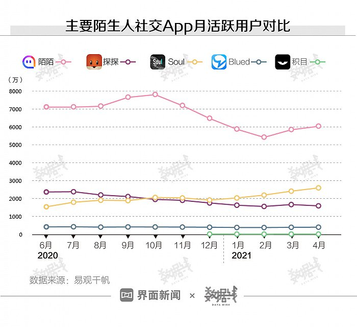 陌陌和探探的用户规模都在下降。据易观千帆数据,2020年6月到2021年4月,陌陌的月活跃用户数减少约1000万,探探减少了近800万。2020年10月,Soul的月活跃用户数首次超过探探,之后差距逐渐扩大。