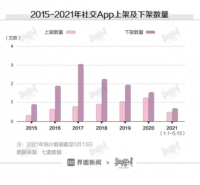 监管趋严也在压缩陌生人社交市场空间。七麦数据显示,2015年至今,每年社交App下架都比上架要多。2017年有超过3万款社交App下架,当年社交App上架数量不足一万款。截至2021年5月13日,今年社交App已下架近7000款,上架约5000款,差距依旧不小。大浪淘沙下,陌生人社交是否还有新的可能?