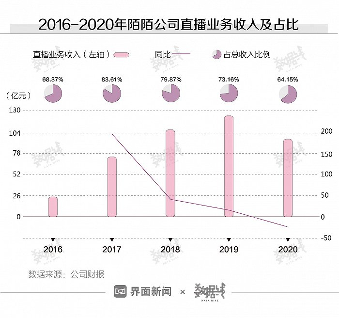陌陌公司“依赖”的直播业务也撑不住了。2016年至2020年,陌陌公司直播业务增速持续下降。截至2020年,陌陌公司直播业务收入为96.38亿元,同比减少22.6%。直播业务收入占总收入比例从最高83.6%下降至64.2%,减少近20个百分点。