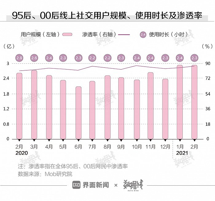“95后”、“00后”都爱线上交友。据Mob研究院,截至2021年2月,“95后”、“00后”线上社交用户规模近3亿,社交App在“95后”、“00后”中渗透率近9成。他们每天花在社交App上的时间超过2小时。