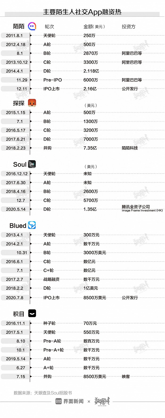 从融资情况来看,5款主要陌生人社交App中,Blued经历8轮融资,陌陌和积目分别经历7轮融资,探探和Soul分别经历5轮融资。其中,阿里巴巴投资陌陌,腾讯投资Soul。陌陌和Blued母公司蓝城兄弟均已赴美上市,Soul已于近日向美国证券交易委员会提交招股书。