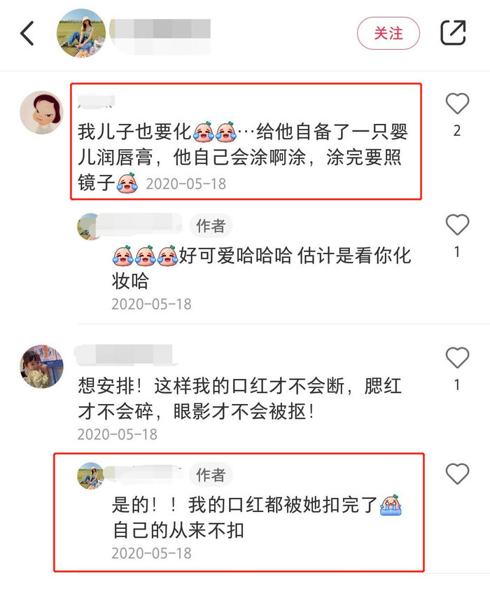 网友@绿茶不绿的女儿也是有着对化妆品无比狂热的心,“估计经常看到我出门前化妆,从小就虎视眈眈我的化妆品。”