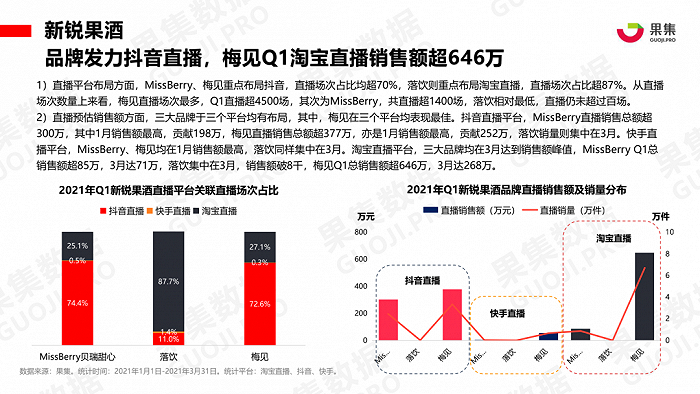 新锐果酒品类中,贝瑞甜心和梅见两个品牌,Q1总直播场次分别达1400场和4500场。其中贝瑞甜心Q1在抖音直播预估销售额超300万,梅见同期抖音直播预估销售总额为377万,梅见Q1在淘宝直播预估销售额达646万。