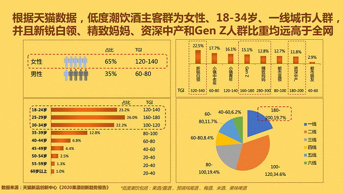 女生成了喝酒的新人群。据天猫新品创新中心《2020果酒创新趋势报告》,低度酒的主要客群为女性、18-34岁、一线城市人群,并且新锐白领、精致妈妈、资深中产和Z世代人群比重均高于全网。