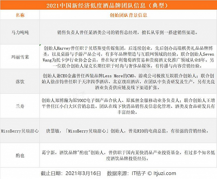 某酒饮MCN机构从业者肖颖则认为,新兴低度酒品牌,更像是营销公司。“我们之前了解过,很多品牌的创始人都不是做酒出身。”IT桔子的资料也证明了这一点,低度酒品牌的创始团队多为销售、游戏、电背景。