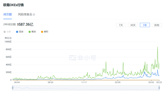 这一点也有数据为证。据非小号数据显示,无论是在OKEx平台上、还是在火币平台上,都能看出在过去一年,期货交易的成交额远远高于现货交易的成交额。