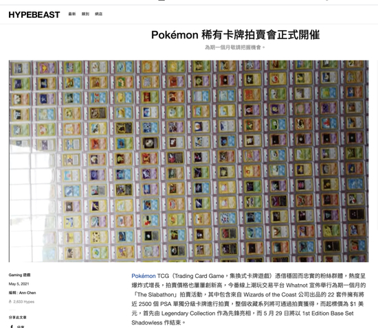因此在拍卖行里,出现了越来越多原盒未开封的宠物小精灵卡牌拍品,今年1月,一盒未开封的初代宠物小精灵卡牌在拍卖行以40.8万美元易手。如果他手气够好,开出了喷火龙,那么就差不多能回本了。