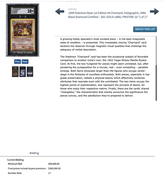 在2019年8月,一张完美品相的初代全息喷火龙闪卡的价格能卖到5万美元。但当到了2021年4月,同样品相的卡牌就能在美国知名体育纪念品拍卖行 “ 高丁拍卖 - Goldin Auctions ” 拍卖上以36万美元价格成交。