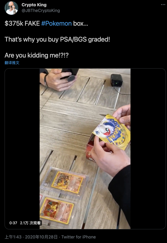 从某种意义上来说,现在的宠物小精灵卡牌市场就有点像古钱币市场,光是凭经验收藏,老江湖都有可能被蒙:前一阵有个老玩家花了37.5万美元买了一盒初代第一版的卡盒,本想着当着朋友们面享受拆卡包的刺激,却发现买到了一盒假货,亏哭了。