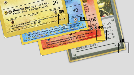 就像《炉石传说》一样,很多宠物小精灵卡牌也在卡面上标注了普通、稀有、史诗、传说这种珍稀度指标:圆圈代表普卡、菱形代表稀有卡、五角星代表史诗卡、多颗五角星则代表传说。