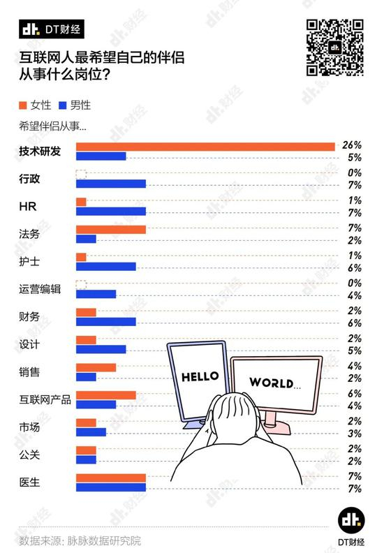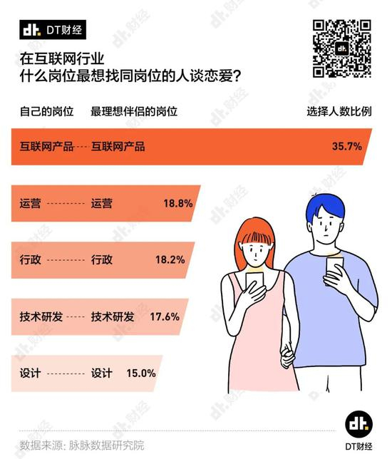 另一个有趣的现象是,不少互联网人在挑选另一半的理想职业时,几乎都选择了‘自己人’。比如技术研发人员偏好技术研发人员、产品经理也倾向于产品经理。