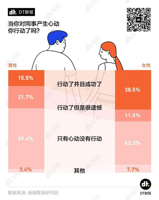数据显示,有59.4%的男性都是‘只有心动没有行动’,玛丽苏的职场恋爱故事果然只存在网文和电视剧中。相反,女性就显得更大胆,颇有‘霸道女总裁’的风范,有50%的女性在心动后都会采取行动,而且行动后成功恋爱的比例比遗憾结局的比例高。