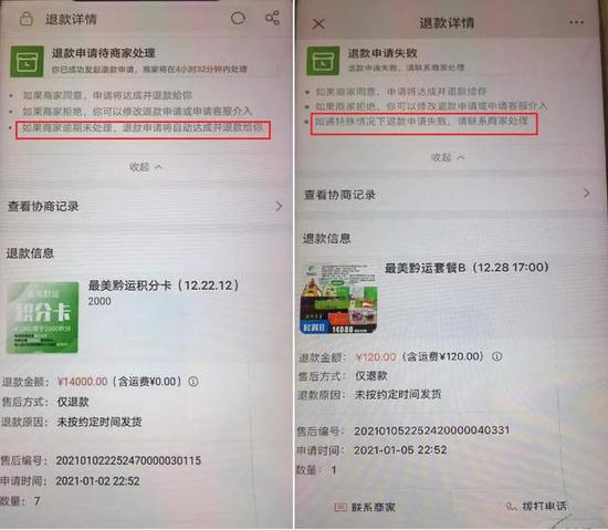 孙吉发给AI财经社的截图显示,1月5日他申请退款时,退款界面的提示文字是“如果商家逾期未处理,退款申请将自动达成并退款给你”,几天后,退款不仅失败,提示文字还变成“如果特殊情况下退款申请失败,请联系商家处理”。