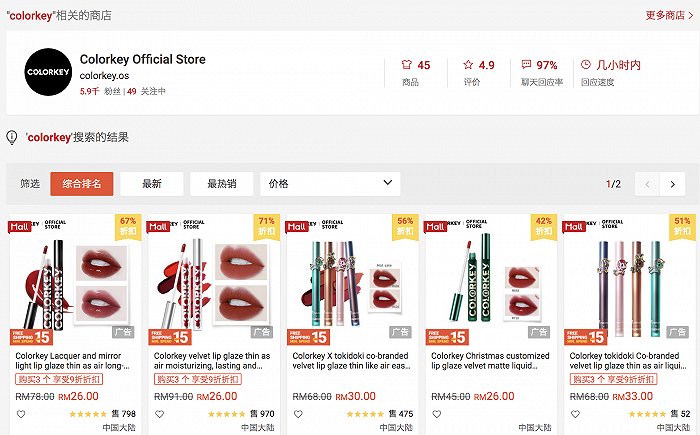 除了官网销售,品牌们也会借助其它渠道平台。目前,包括完美日记、花西子均借助了天猫出海。另一个彩妆品牌珂拉琪colorkey,则入驻了东南亚最大的电商平台Shopee。