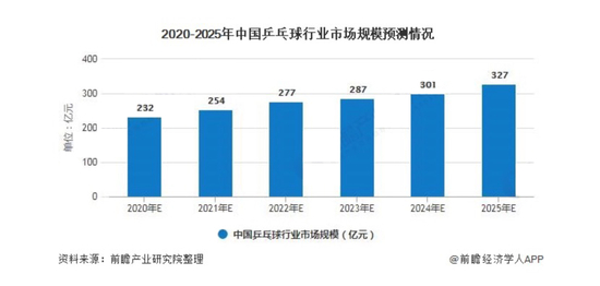 因为竞赛成绩出色,参与人口众多,乒乓球成了一块不小的蛋糕。前瞻研究院调研显示,2019年中国乒乓球行业的市场规模约为213亿元,到2025年预计将达327亿元。