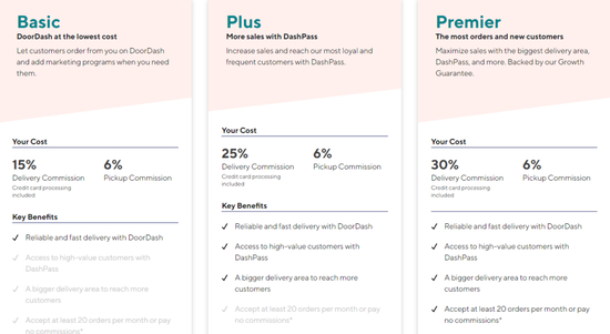 费率透明化不止发生在中国,目前已成全球外卖行业趋势。近日,美国外卖平台DoorDash针对费率进行了调整,其中最大的变化在于更加透明化。在新费率政策下,DoorDash将收费项目分为了平台基础通道费(佣金)和配送类佣金,基础通道费是按照统一的6%进行收取,而支付配送类佣金则会根据商户的营销需求及配送区域的规模大小来收取三种不同级别(普通basic、优选Plus、精选Premier)的费用,最低15%,最高达30%。