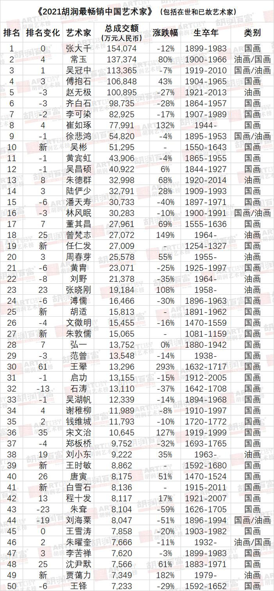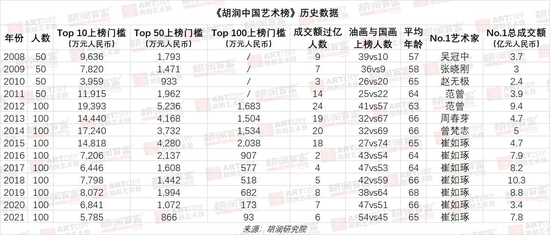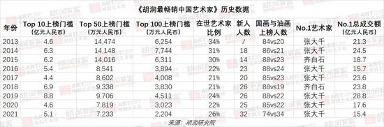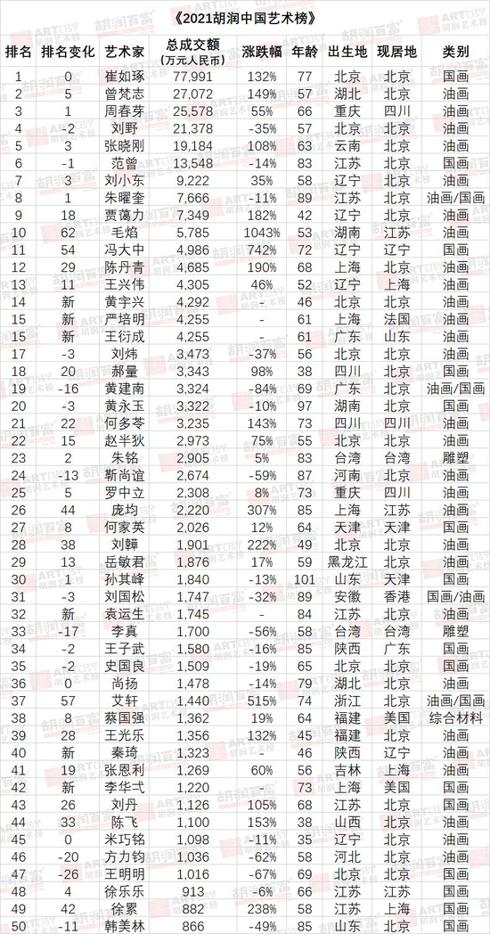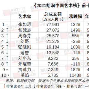 《2021胡润中国艺术榜》根据2020年度公开拍卖市场作品总成交额为当年在世的中国艺术家排名。上拍艺术品均为通过公开场地拍卖,而不包括通过非公开场地出售(画廊、艺术家本人及私人交易),且包含拍卖公司的中介费用。