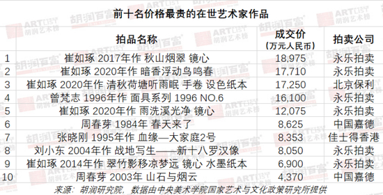 前十名价格最贵的在世艺术家作品中,5幅是国画,5幅是油画。其中,5幅国画均为崔如琢的作品;5幅油画中,两幅周春芽的作品,另外3幅分别是曾梵志、张晓刚和刘小东的作品。
