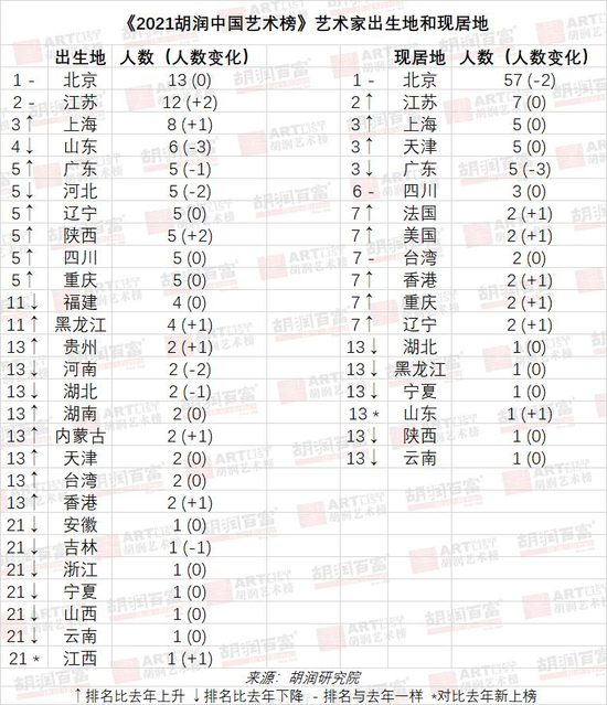 北京一直是最多上榜艺术家出生和居住的城市。今年现居北京的上榜艺术家仍以57人绝对领先于其他城市,虽比去年减少2人;江苏以7人升至第二;广东比去年减少3人,至5人,跌至第三;天津和上海人数不变,和广东并列第三。山东今年新上榜,有1人。胡润表示:“北京是胡润百富榜上财富最集中的城市,有325位上榜企业家,北京也是上榜艺术家最多的城市,或许是藏家吸引了艺术家。”