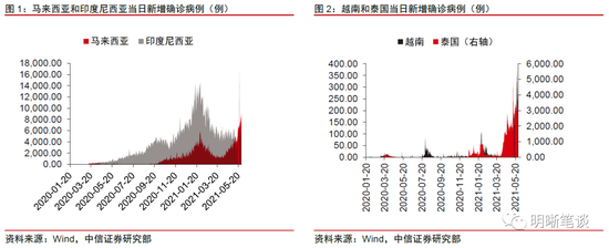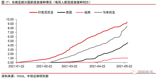 东南亚疫情再起,全球贸易或再受冲击。受印度疫情扩散影响,今年5月以来东南亚地区疫情有所加重。泰国、越南、马来西亚以及印度尼西亚等国疫情再度爆发,2021年5月以来当日新增新冠确诊病例再次激增。以越南为例,疫情集中爆发在北江省和北宁省两个主要工业地区,工人密集度高,部分工厂因此也暂时关闭。考虑到东盟作为国际贸易以及全球制造业产业链中的重要一环,同时此次疫情得到整体控制尚需时间,我们认为全球供应能力或因此再受打击,实现进一步修复的时间点将延后。
