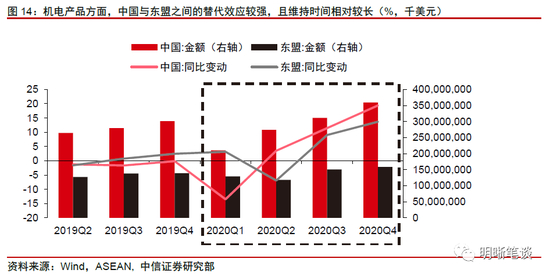 如何看待中国对东南亚出口的替代效应。我国与东南亚国家主要在机电品类和纺织品类领域存在竞争关系。具体来看,劳动密集型产品(以纺织品为代表)的替代效应较容易发生,具体表现为2020年二季度东南亚疫情爆发,在纺织产品出口方面中国对东盟在短期内呈现出较强的替代效应。随着后续东南亚疫情得到控制,强替代效应又促使此类订单快速回流至东南亚地区。因此,我们认为我国对纺织产品出口的替代效应将呈现“来的快,去的快”的特征,具体时间点取决于东南亚疫情恢复情况。另一方面,我国的机电产业正处于转型升级阶段,劳动密集型和资本密集型的机电产业链并存,因此机电产品出口方面既存在一定韧性,又具备与东盟之间的替代效应。