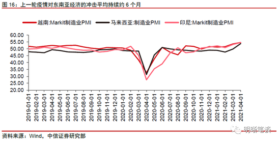 综上所述,从出口贸易的替代效应来看,东南亚疫情爆发或使得我国纺织产品出口呈现短期替代效应,机电产品呈现长期替代效应。结合越南、马来西亚和印度尼西亚的制造业PMI数据,以PMI持续走低为依据,上一轮疫情对其经济的冲击平均持续约6个月。考虑到政府管控经验的积累、疫苗接种进度等因素,我们预计此次疫情对经济基本面造成的冲击或短于上一次,持续时间或为3-4个月左右。在此期间,劳动密集型机电产品和纺织品的替代效应将为我国纺织制品和机电产品两大品类出口提供支撑。