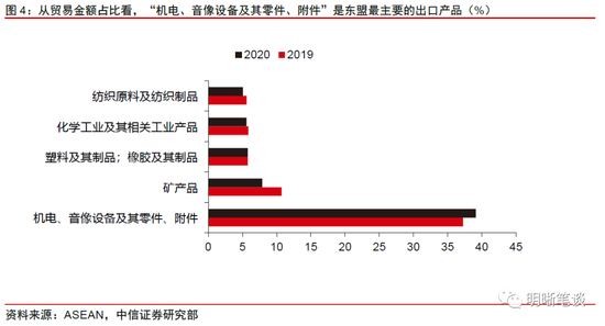 东盟是国际贸易中的重要一环,为全球供应机电、矿产品、塑料、化工原料及制品和纺织原料及制品等。全球视角来看,东盟2019年货物出口金额占同年全球出口金额的7.49%,2020年小幅上升至7.87%;2019年货物进口金额占全球进口金额的7.22%,2020年轻微下降至7.12%。分产品来看,作为全球产业链的重要组成部分,“机电、音像设备及其零件、附件”(HS分类标准)是东盟最主要的出口产品,2019年其出口金额占东盟对全球出口金额比例约为37.26%,2020年所占比重上涨至39.14%;前五大主要出口产品2019年合计占比约65.18%,2020年合计占比约63.42%。