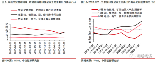 印度尼西亚主要向全球出口矿物燃料和动植物油脂,疫情对其主要出口品的影响分化明显。在HS分类标准下,印度尼西亚的主要出口商品包括“矿物燃料、矿物油及其产品、沥青”、“动、植物油、脂、蜡;精制食用油脂”和“电机、电气、音像设备及其零附件”。在2019年上述3类产品的每季度出口金额占总出口金额的平均比例分别约为20.36%、10.50%和5.38%。2020年第一轮疫情在印度尼西亚爆发期间,其“电机、电气、音像设备及其零附件”出口金额同比在第二季度下跌14.71%;而矿物燃料的出口金额同比下降趋势则从二季度延续至三季度;相较之下,“动、植物油、脂、蜡;精制食用油脂”出口未受到疫情扰动,逆势保持同比增长。考虑到印度尼西亚的贸易结构和产品出口金额同比变动,此次疫情爆发或对印度尼西亚2021年二季度和三季度的矿物燃料产品出口影响较大,对动植物油脂和机电产品影响有限。