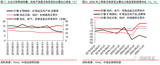 马来西亚以出口机电产品和矿物燃料为主,类比2020年Q2疫情对其主要出口品的影响,本轮疫情或对机电产品出口产生影响较大。在HS分类标准下,马来西亚的主要出口商品包括“电机、电气、音像设备及其零附件”、“ 矿物燃料、矿物油及其产品、沥青”和“核反应堆、锅炉、机械器具及零件”。在2019年上述3类产品的每季度出口金额占总出口金额的平均比例分别约为34.42%、14.48%和9.16%。2020年二季度疫情爆发后,马来西亚的机电产品出口金额同比下跌11.75%。在疫情有所控制的情况下,矿物燃料出口仍然持续处于负同比增长状态,机电产品出口则逐步恢复。类比来看,此次疫情或打乱机电产品出口复苏节奏,导致其短期内出现同比回落。