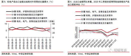 机电产品和轻工制品出口占越南出口比重较大,二次疫情或对2021年二季度和三季度越南相关产品出口影响较大。在HS分类标准下,越南的主要出口商品包括“电机、电气、音像设备及其零附件”、“鞋靴、护腿和类似品及其零件”、“非针织或非钩编的服装及衣着附件”以及“针织或钩编的服装及衣着附件”。2019年上述4类产品的每季度出口金额占总出口金额的平均比例分别约为36.63%、7.18%、5.71%和5.62%。2020年二季度为越南上一轮疫情爆发的主要时间,期间越南的机电类产品出口金额同比下跌0.87%,逆转了自2019年一季度以来的持续高增局面;鞋靴和服装类产品的出口金额同样出现大幅下跌。此次疫情在越南工人密度高的北江省、北宁省工业区传播,两省作为越南重要的工业产地,当地多家企业工厂目前已经暂时停产,或导致供应链和生产链受阻严重,受此影响越南的机电产品和轻工制品出口或有所下降。