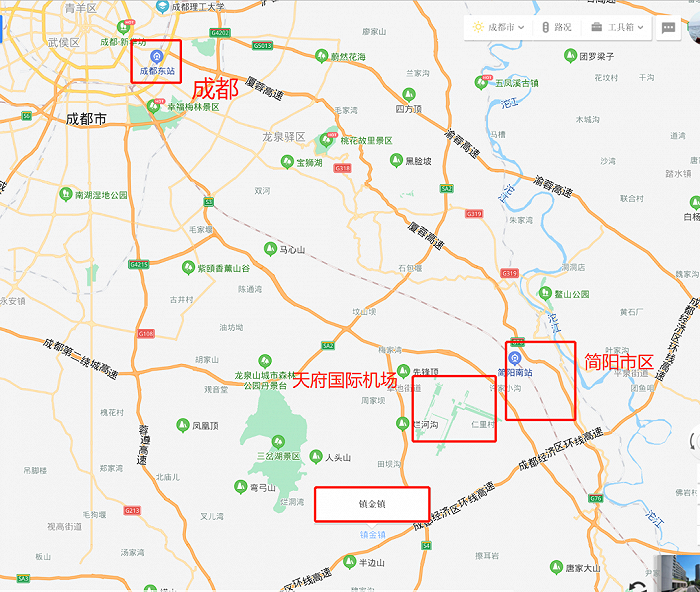 百度地图上,关于镇金、简阳与成都的区位