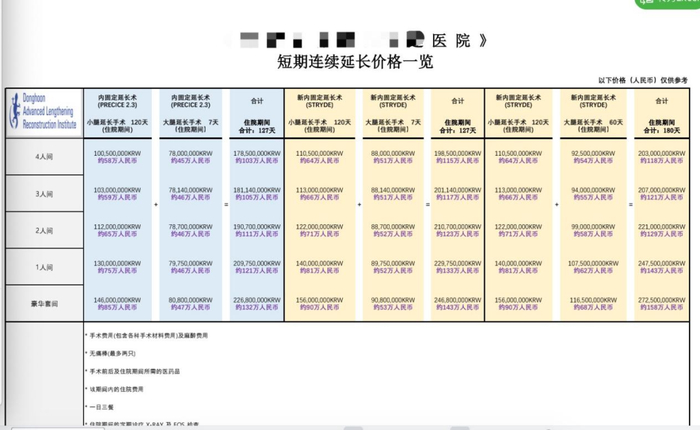 一家韩国“肢体延长医院”在官网上发布的费用价目表显示,肢体延长分为“内固定”和“速成”,手术后住院的房间也从“4人间”到“豪华间”分成了四个等级,加上两年后的固定拆除,完成全套手术最低都需要逾100万人民币,还不包括机构宣称的10%税率与术后护理等费用。