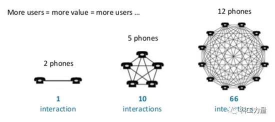(电话是网络效应的典型例子,从两部电话到12部电话,网络用户增长6倍,用户间的连通组合却增长了66倍,每一个新入网用户,都会为所有老用户提供增量价值)