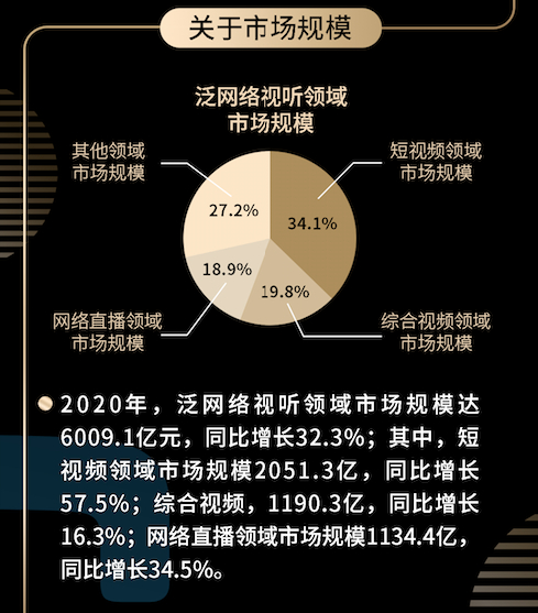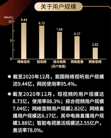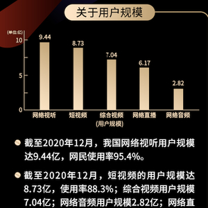 《中国网络视听发展研究报告》自2015年首次发布后,已连续发布7年。《报告》显示,截至2020年12月,我国网络视听用户规模达到9.44亿,较2020年6月增长4321万。“多达95.4%的网民是网络视听用户。”《报告》发布现场,中国网络视听节目服务协会副秘书长周结专门指出,2020年泛网络视听领域市场规模超6009.1亿元,较2019年同比增长32.3%。“虽受疫情影响,但网络视听行业依旧高速发展。”