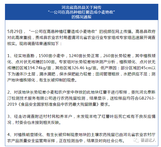 6月3日,针对媒体报道石家庄一公司多种药剂催生“毒红薯”致土地受伤严重、小麦绝收的情况,高邑县农业农村局发布调查通报后,微信公号“金财经”发布《河北高邑通报“毒红薯”事件,爆料人“欲哭无泪”,作出四点回应》,文中爆料人石女士对于高邑县情况通报表示“欲哭无泪”。