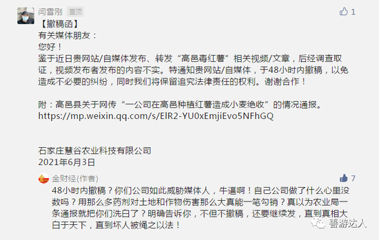 针对撤稿函,“金财经”硬气答复:48小时内撤稿?你们公司如此威胁媒体人,牛逼啊!自己公司做了什么心里没数吗?用那么多药剂对土地和作物伤害那么大真能一笔勾销?真以为农业局一条通报就把你们洗白了?明确告诉你,不但不撤稿,还要继续发,直到真相大白于天下,直到坏人被绳之以法!